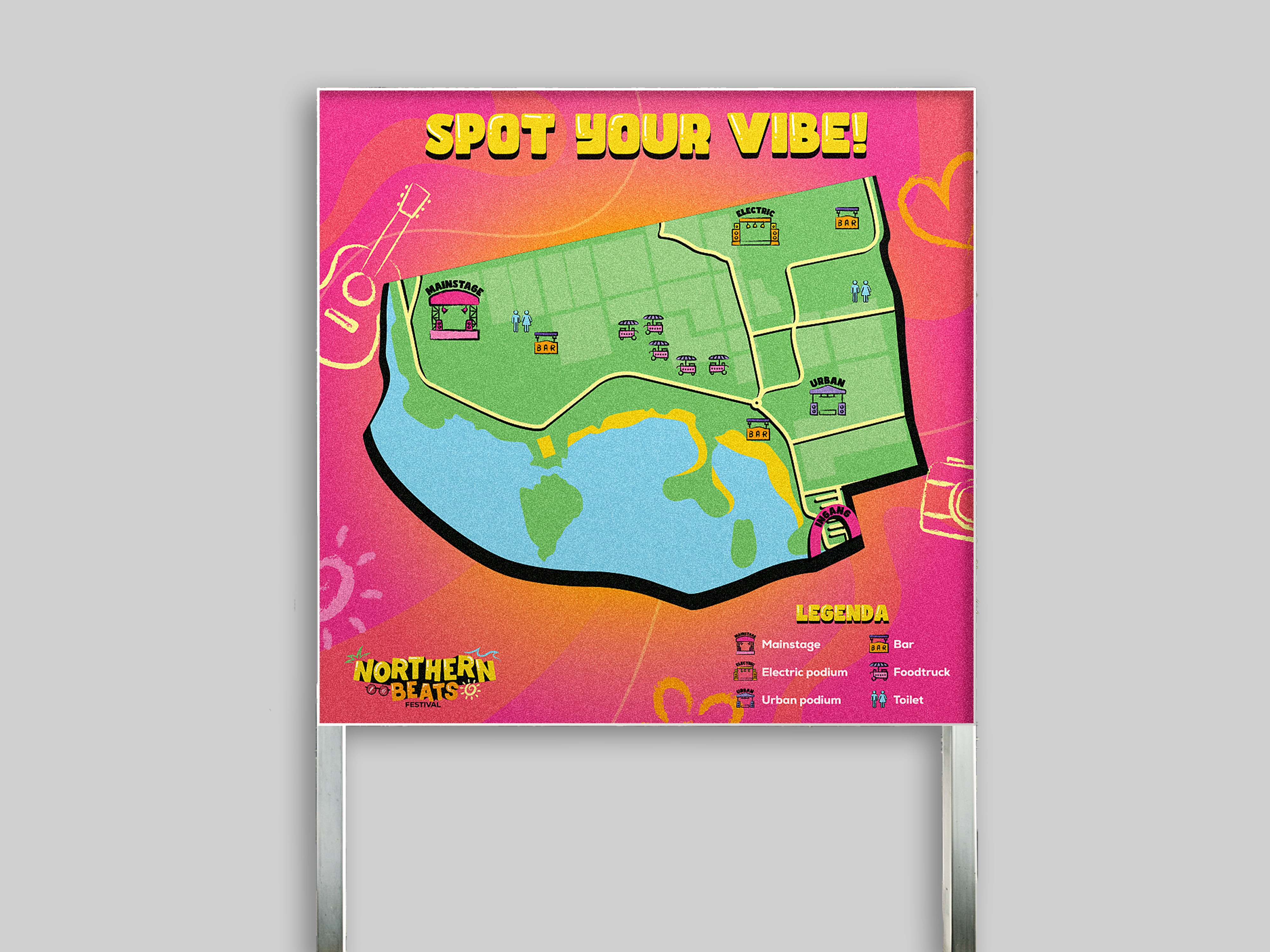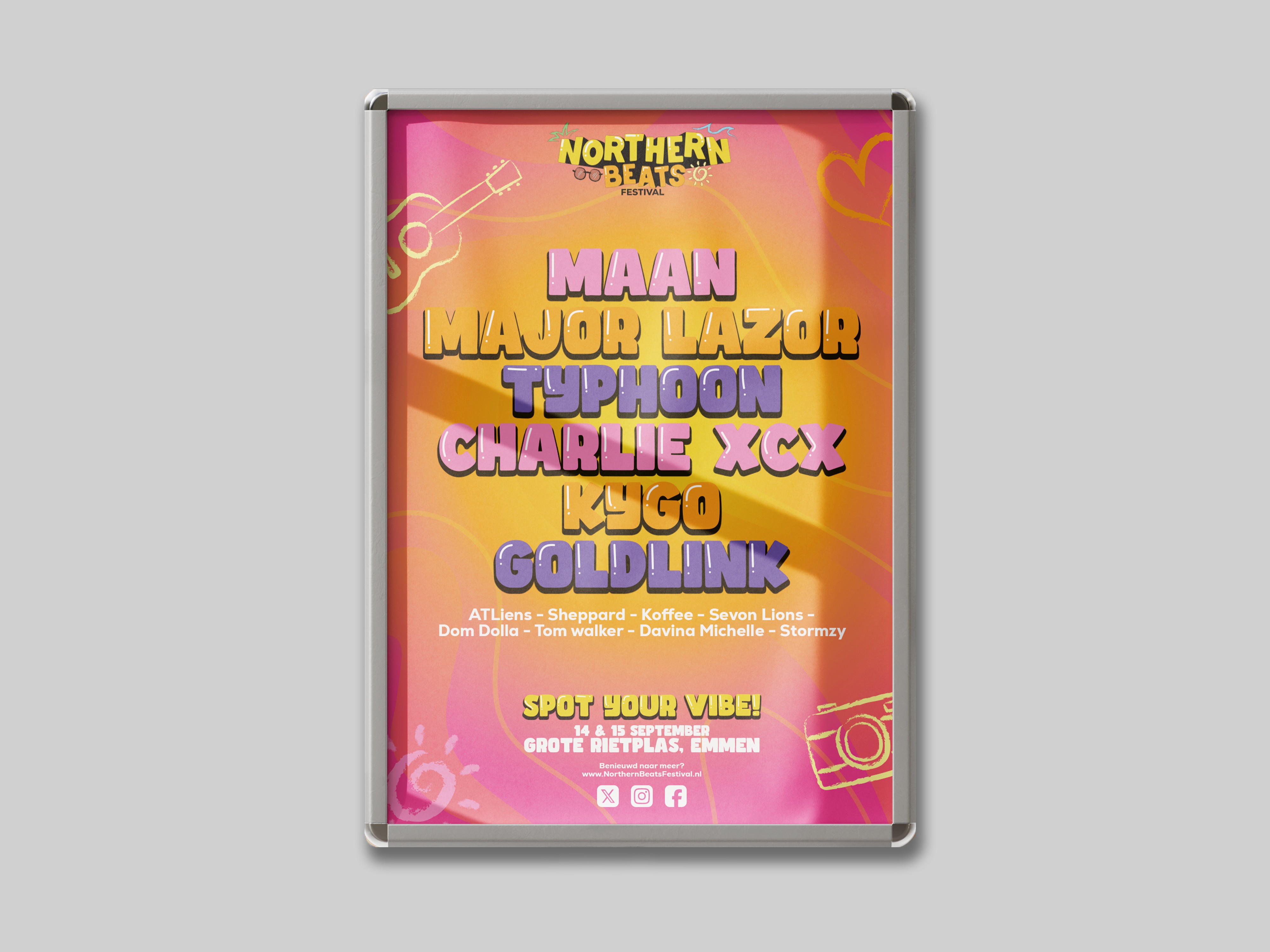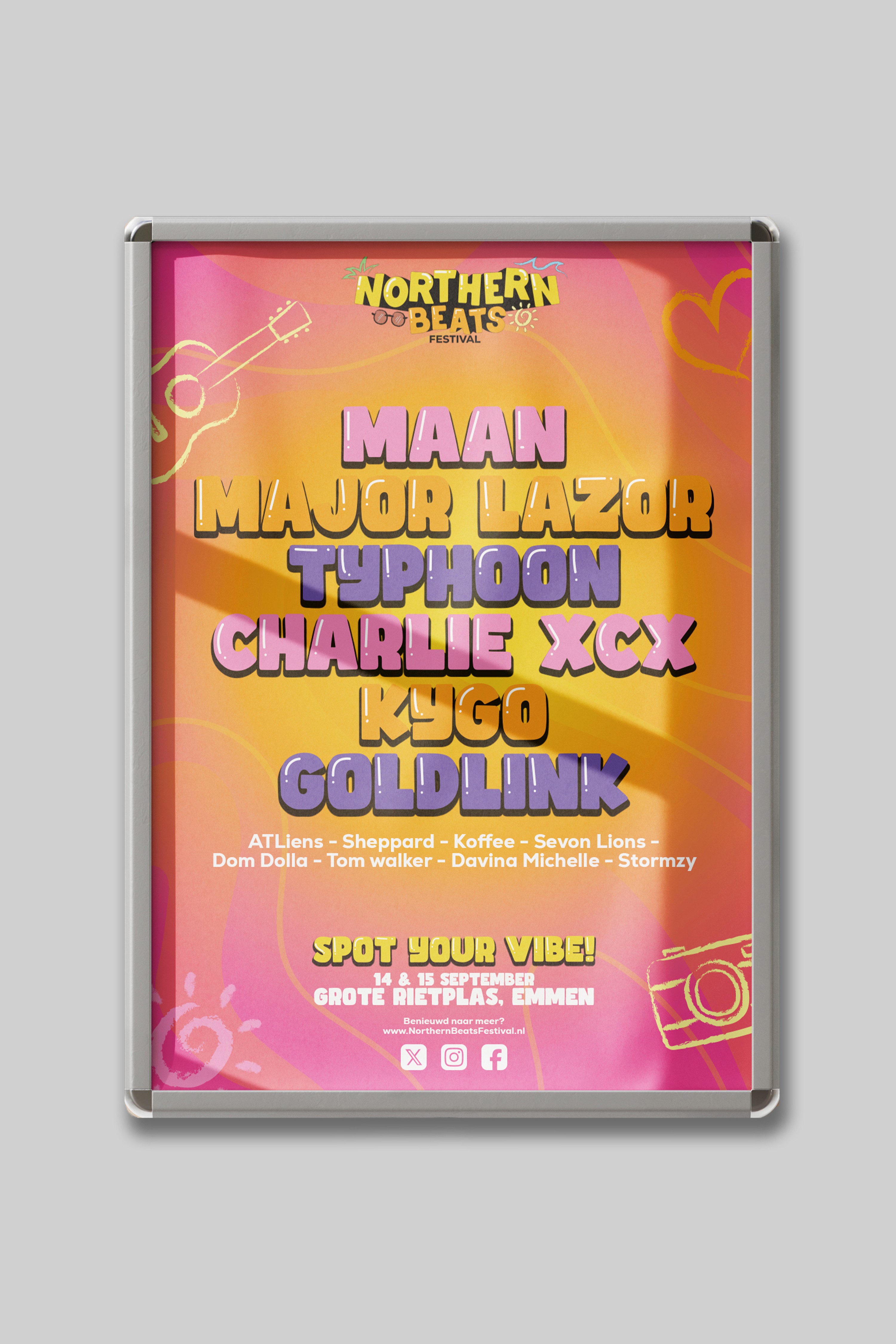 In mijn ontwerp heb ik de zomervibe en de natuurlijke omgeving centraal gezet, gecombineerd met een frisse en eigentijdse uitstraling die past bij de jonge en sociale doelgroep van het festival. Daarnaast hebben we een campagne ontwikkeld onder de naam “Spot Your Vibe”, waarmee het festivalbezoek op een creatieve manier onder